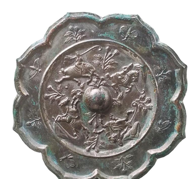 隋唐時(shí)期是中國(guó)封建政治經(jīng)濟(jì)文化高度發(fā)展繁榮的時(shí)期,唐代社會(huì)經(jīng)濟(jì)全面發(fā)展,手工業(yè)各部門也都興旺發(fā)達(dá),青銅鑄造業(yè)中的銅鏡業(yè)尤為突出,無(wú)論造型、題材、紋飾、鑄造工藝,都突破了前代的模式,達(dá)到了中國(guó)古代銅鏡藝術(shù)的巔峰。唐鏡鏡型厚實(shí),方形鏡、菱花形鏡、葵花形鏡流行;紋飾題材多見瑞獸、飛鳥以及葡萄、花草等;瑞獸葡萄鏡最具特色,是中西文化融合的杰作。