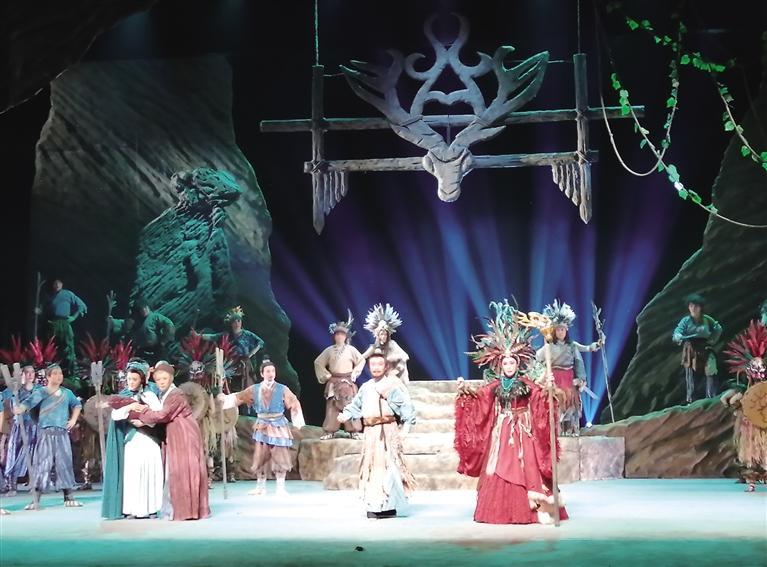 第三個步驟是大禹與土著山民首領山戎在強烈戲劇沖突中果斷地在改變自己的行為,并且以“忘我”的犧牲精神求得“天地之和,和在心中”的主旨意義。任何對自然生態(tài)的態(tài)度和沖突到頭來都集中體現在“人與人”的觀念習俗情仇恩怨的激烈紛爭之中。是故治水,也要“治理”自己的行為,升化自己的心智,以自己的真情坦露大愛, 甚或犧牲自己的性命。這就是“戲”的魅力。