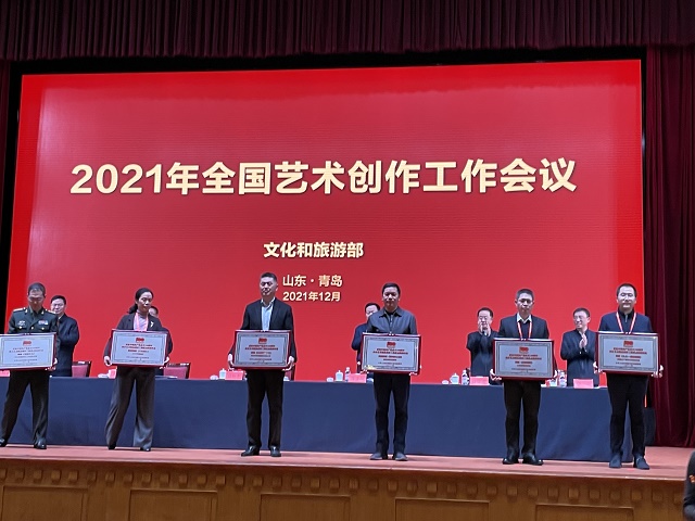 中國甘肅網(wǎng)12月19日訊 12月18日,文化和旅游部在山東省青島市召開的“2021年全國藝術(shù)創(chuàng)作工作會議”上,發(fā)布了“慶祝中國共產(chǎn)黨成立100周年舞臺藝術(shù)精品創(chuàng)作工程”入選名單,頒發(fā)了“慶祝中國共產(chǎn)黨成立100周年舞臺藝術(shù)精品創(chuàng)作工程獎牌”。甘肅省文化和旅游廳遴選推薦的舞劇《絲路花雨》《大夢敦煌》《彩虹之路》、隴劇《官鵝情歌》、小品《你笑起來真好看》等5部舞臺藝術(shù)精品,經(jīng)文旅部評審正式入選“舞臺藝術(shù)精品創(chuàng)作工程重點(diǎn)扶持作品”。甘肅省歌舞劇院創(chuàng)排的舞劇《絲路花雨》作為12家“百年百部”工程受獎單位在全國藝術(shù)創(chuàng)作工作會議上接受獎牌和榮譽(yù)證書,甘肅省文旅廳、山東省文旅廳等參會代表12家領(lǐng)獎單位上臺領(lǐng)獎,充分展現(xiàn)了文旅部對甘肅省入選作品質(zhì)量及組織工作的高度肯定。