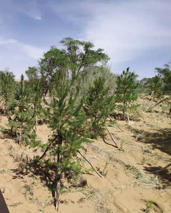 我和同伴撲進(jìn)沙海柔軟的懷抱。認(rèn)識到,再小的沙粒,也不能與塵世隔絕,我與沙,結(jié)緣于此。沙海里,一沙一世界。黃沙大膽赤裸地暴露在天幕蒼芎下,以大,以小,涵納無窮。“沙沙”的足音里,印下我深深淺淺兩行腳印,宣告著浪漫與踏實(shí)的存在。我來到習(xí)近平總書記親手栽植的“五棵松”下,仰視青松,綠云葳蕤,生機(jī)勃勃??倳浀年P(guān)懷和鼓勵,黃沙熱熱地、輕輕地長出了更多綠色羽翼,這羽翼在不斷地生長壯大,有“代代相傳”的精神,綠色終究會覆蓋全部騰格里。捧起一捧黃沙,細(xì)沙像嬰兒肌膚般的柔滑,我試圖用臉貼近它,這些黃色的小精靈,從我指縫間輕盈地流淌到松下,似乎在暗示我,要把自己的夢筑進(jìn)治沙精神的瀚海里??茖W(xué)家們已作出結(jié)論:沙漠是人類最后的寶地,別看它現(xiàn)在荒蕪,它里面蘊(yùn)藏著無盡的寶藏和財(cái)富。