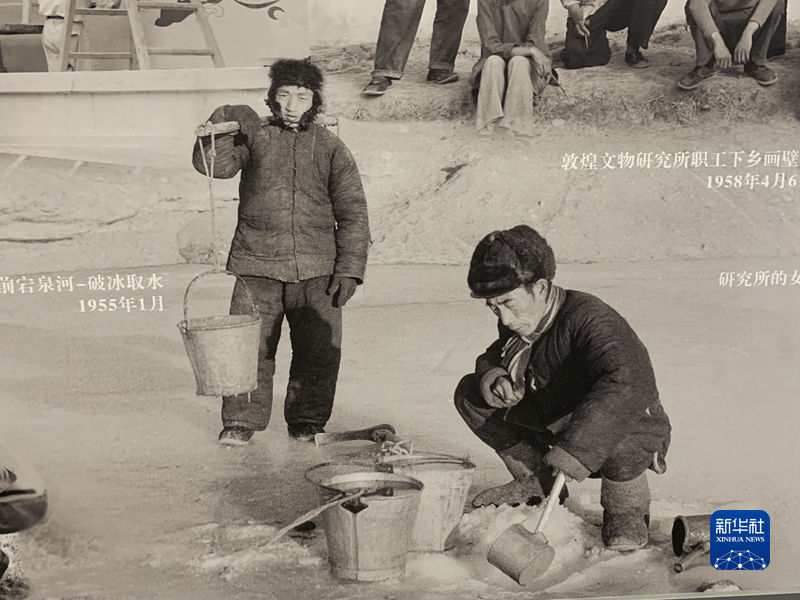 展覽的第二部分,主要呈現(xiàn)1944年“國立敦煌藝術(shù)研究所”成立后,幾代文化工作者扎根大漠、開拓進(jìn)取的歷程。該部分展出了大量老照片,如上世紀(jì)五六十年代,文化工作者破冰取水、耕作勞動(dòng)的場景。