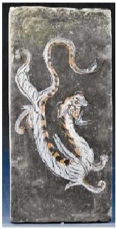 這件高臺(tái)縣博物館館藏的漢晉彩繪虎畫(huà)像磚,長(zhǎng)42.5厘米,寬20厘米,厚6.5厘米,出土于駱駝城苦水口1號(hào)墓葬,屬國(guó)家二級(jí)文物。作為“四神”形象之一,多見(jiàn)于墓葬中磚砌門飾構(gòu)件之上。