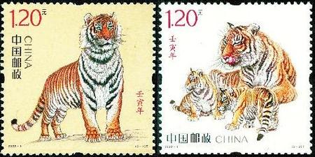 2022年是農(nóng)歷壬寅年,即“虎”年,中國郵政于1月5日發(fā)行《壬寅年》特種郵票,全套2枚。這是中國郵政發(fā)行的第四輪生肖郵票的第七套。虎年生肖郵票仍然延續(xù)了第四輪生肖郵票的“家國”理念:兩枚郵票分別展示了國家的期許、家庭的企盼,組合而成濃濃的新春祝福。