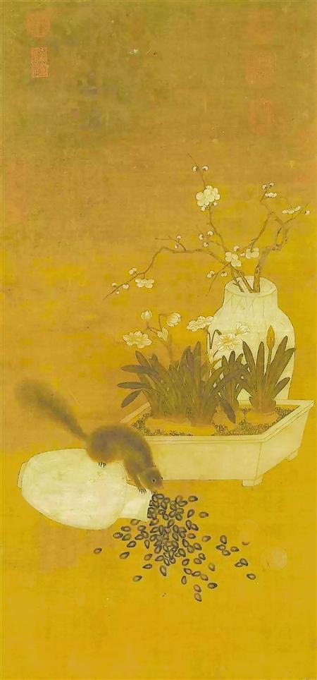 元代的《歲朝圖》中在瓶梅和水仙盆景前,描繪了一只偷堅果的小松鼠,貯果的瓷瓶被打翻,瓜子灑了一地,旁邊還有兩顆打滾的核桃。