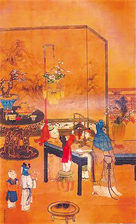 熟稔了這些歲朝清供的組合意象,就可以在單獨(dú)描摹景物之外,將其應(yīng)用到各種其他年節(jié)繪畫中了。清宮流行的嬰戲圖里,歲朝清供就作為背景或具體的物件,融入畫中。