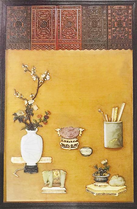 百寶嵌歲朝吉祥御制題詩掛屏,使用各種瓷、玉、寶石、金銀材料鑲嵌而成,也只有皇家才能制作。其中各部分零星擺放,相互之間無甚關(guān)聯(lián),已經(jīng)出現(xiàn)歲朝圖圖案化的苗頭。在后來的發(fā)展中,歲朝清供圖演變成裝飾圖案,出現(xiàn)在服飾、建筑等藝術(shù)中。