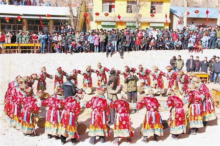 永靖王氏打鐵花、岷縣中寨鎮(zhèn)古莊村的巴當(dāng)舞、文縣鐵樓鄉(xiāng)白馬人的“池哥晝”……在眾多社火展演中,非遺文化遺產(chǎn)項目也在各地舉行。高高蹺、鐵芯子和永登太平鼓表演更是讓人們在驚險、刺激的視覺沖擊中過足了癮。