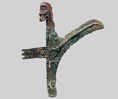 鷹是一些游牧民族崇拜的猛禽,十分威猛。青銅鷹首為軸桿類頂端的飾物,部族首領(lǐng)手執(zhí)桿頭有鷹首的器物以象征權(quán)威和神圣。