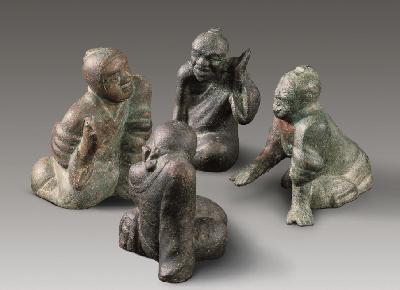 四俑相向跪坐,身著漢代最常見(jiàn)的高領(lǐng)衣服。二人頭頂盤(pán)挽發(fā)髻,二人以寬巾裹首。坐姿不同,形態(tài)各異,最為精彩有趣的是四俑的面部表情,或喜笑顏開(kāi),或怒不可遏,或凝神沉思,或憂傷悲愁。