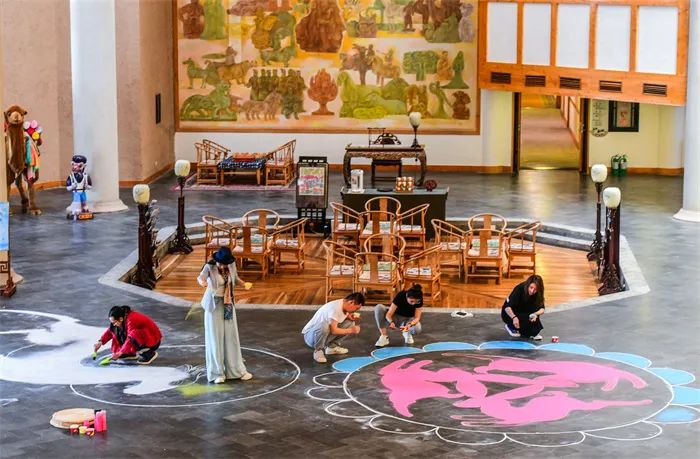 5月8日,母親節(jié),酒泉敦煌市沙文化館以敦煌莫高窟九色鹿壁畫(huà)為摹本,以彩色沙為原料,5人團(tuán)隊(duì)通力合作,在敦煌鳴沙山下的敦煌山莊大堂“繪制”出長(zhǎng)10米寬6米的大型九色鹿沙畫(huà),同時(shí)“繪制”了一幅“三兔藻井”沙畫(huà)圖案,寓意天下母親“福祿安康”“一路平安”,祝天下母親節(jié)日快樂(lè)。