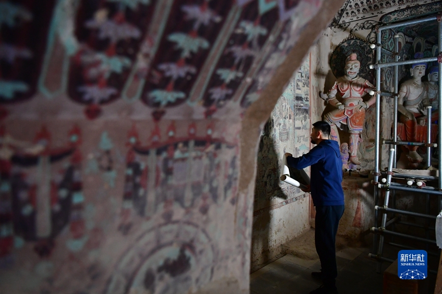 4月19日,在莫高窟第231窟,楊金禮在修復(fù)出現(xiàn)病害的壁畫。新華社記者 杜哲宇 攝