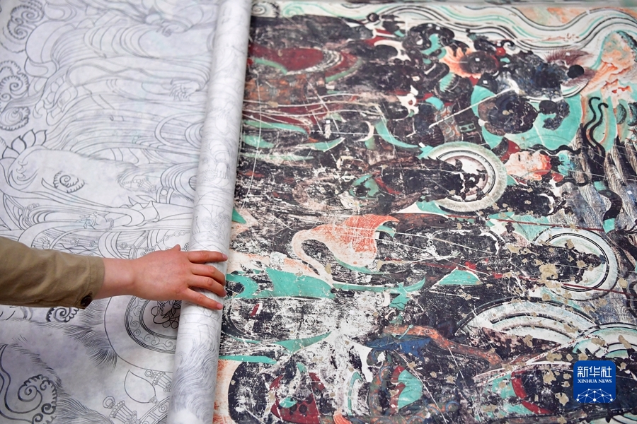 4月19日,在莫高窟第172窟,劉小同在對比臨摹壁畫的細節(jié)。新華社記者 杜哲宇 攝