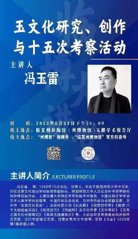 為認真貫徹落實省第十四次黨代會精神,進一步弘揚中國玉文化和民族精神,推動玉文化傳承及玉文化文創(chuàng)產(chǎn)業(yè)發(fā)展。6月21日下午,甘肅文化發(fā)展研究院常務(wù)副院長馮玉雷受邀在臨夏州彩陶館(州博物館)學術(shù)報告廳作了題為《玉文化研究、創(chuàng)作與十五次考察活動》的學術(shù)講座。
