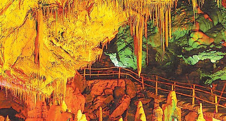 洞口低矮狹窄,感覺洞內(nèi)昏暗潮濕,深不可測(cè)。順著崎嶇不平的臺(tái)階,高一腳低一腳摸索著往前走了十幾步,忽然,眼前色彩繽紛,美輪美奐,這是何等美妙的仙境,各類石筍、鐘乳石、石柱像是午夜的森林,一下子占據(jù)了所有的視野。