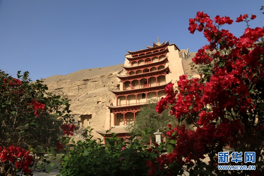 盛夏時(shí)節(jié),甘肅省敦煌市莫高窟景區(qū)在三角梅、百日菊等花草的映襯下,顯得分外美麗迷人。