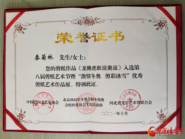 2021年11月由中國(guó)民間文藝家協(xié)會(huì)、河北省文學(xué)藝術(shù)界聯(lián)合會(huì)主辦,河北省民間文藝家協(xié)會(huì)、中共蔚縣人民政府承辦的“第八屆剪紙藝術(shù)節(jié)暨激情冬奧.剪彩冰雪”優(yōu)秀剪紙藝術(shù)大賽中,剪紙作品《龍騰虎躍迎奧運(yùn)》榮獲優(yōu)秀收藏作品同時(shí)被河北省蔚縣博物館永久收藏,并頒發(fā)收藏證書(shū)。