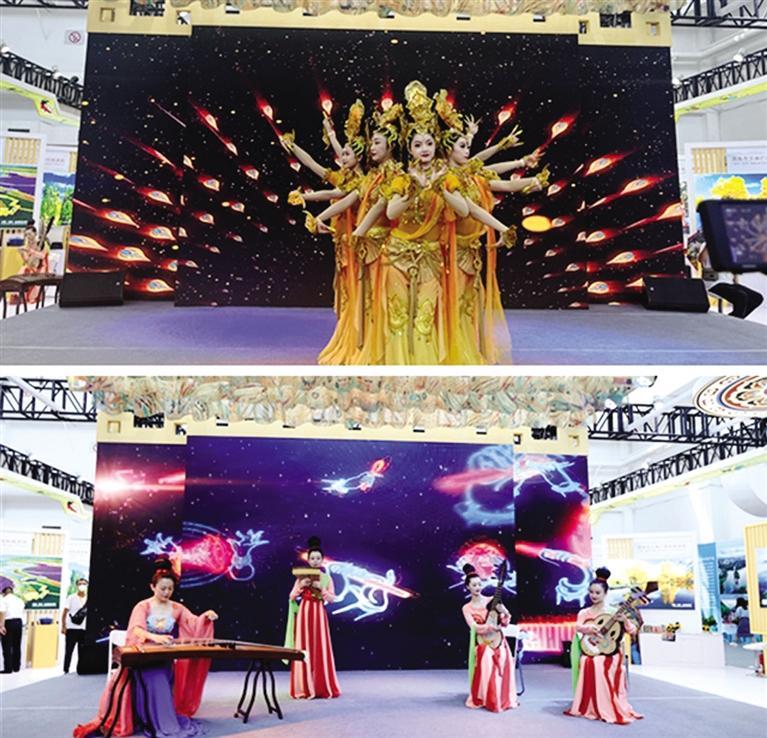 甘肅展區(qū)舞臺(tái)上,身著古裝的演員們生動(dòng)演繹著《千佛》《散花飛天》《反彈琵琶長綢舞》等極具甘肅特色的敦煌古樂和敦煌舞蹈,令游人流連忘返。