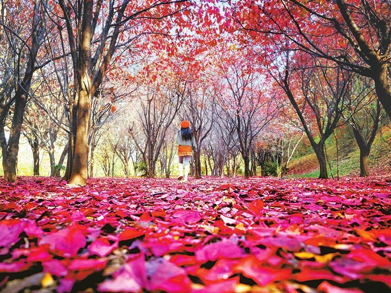 深秋的天水市秦州區(qū)南郭寺大景區(qū)被豐富多彩的顏色包圍,蜿蜒曲折的道路兩旁,各種樹(shù)木色彩斑斕、美不勝收。一陣微風(fēng)吹過(guò),五彩斑斕的樹(shù)葉落到山間的步道上,鋪就了一層“多彩絢麗的地毯”。漫步其中,一幅人與自然各美其美、美美與共的美麗畫(huà)卷依山鋪就開(kāi)來(lái),迷醉游人。那一刻,詩(shī)圣杜甫《秦州雜詩(shī)》秋天里的南郭寺,在陽(yáng)光的輝映下,滿(mǎn)目秋色皆是美景、皆是詩(shī)意。