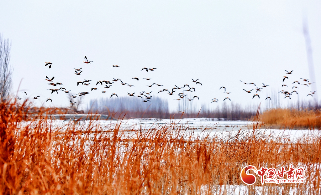 12月20日,在甘肅省酒泉市銀達鎮(zhèn)花園水庫,一群候鳥正在戲水、覓食,為祁連山下的戈壁大地增添了一道亮麗的景色。