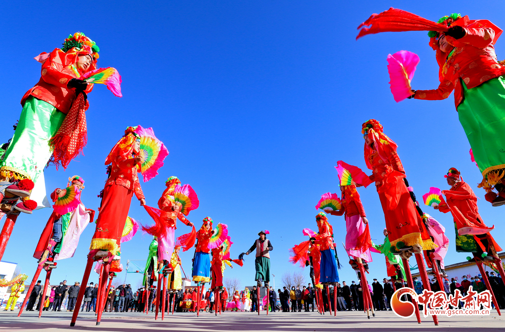 1月9日,甘肅省張掖市甘州區(qū)花寨鄉(xiāng)的社火表演隊(duì)正在文化廣場(chǎng)上加緊排練。