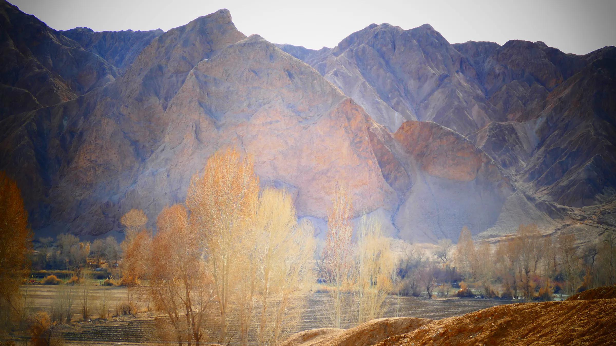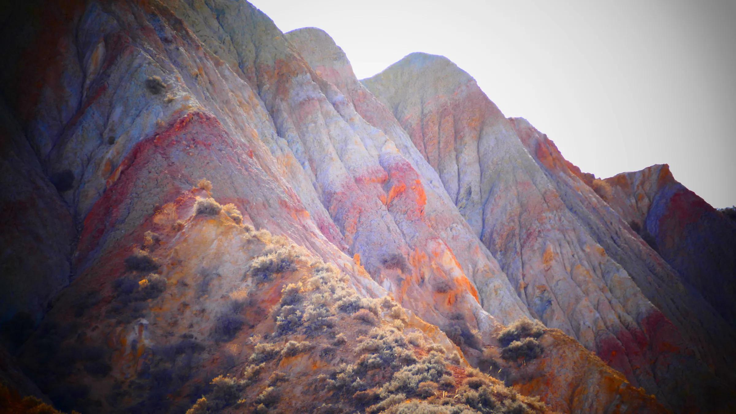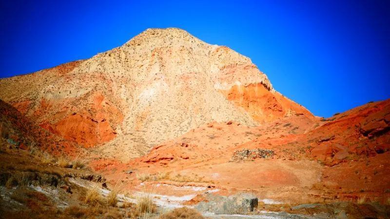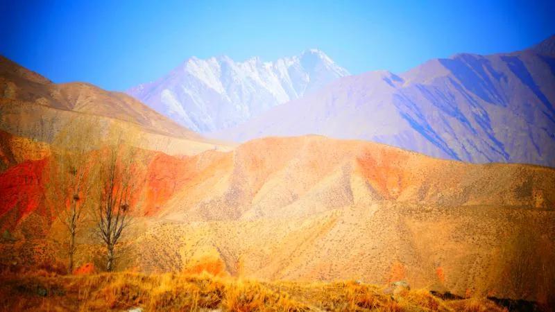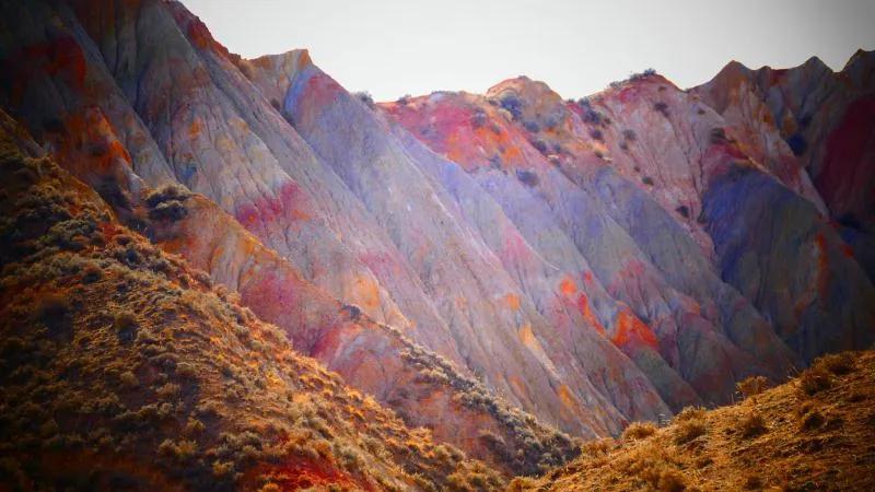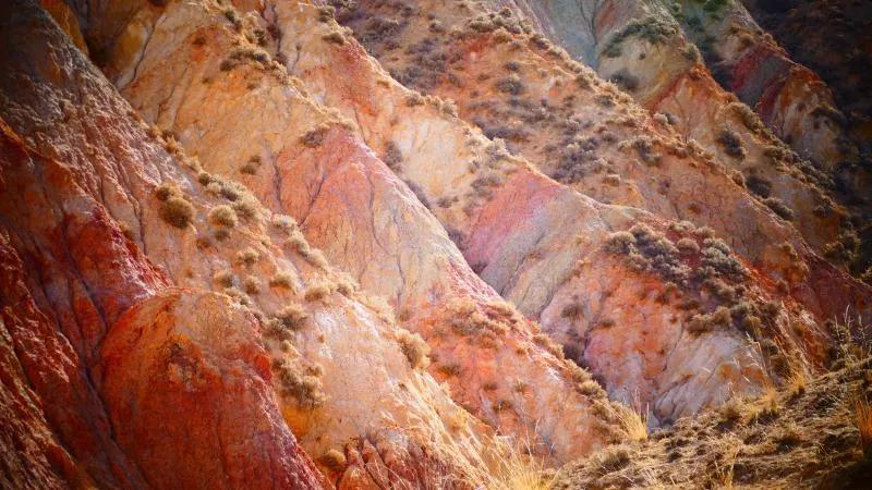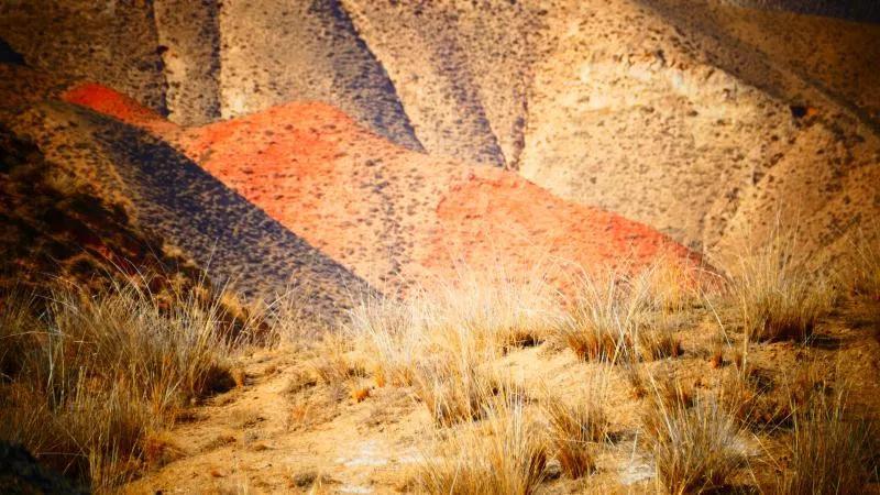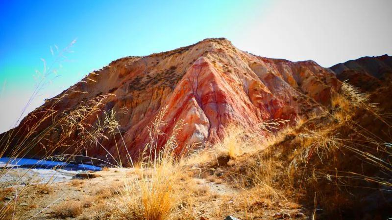 從馬營(yíng)河大峽谷南端再向南一眼望去就是祁連雪山,沿著河道通過(guò)高臺(tái)縣新壩鎮(zhèn)的紅沙河村,向東南走進(jìn)祁連山脈可見(jiàn)一片五顏六色的奇觀,又一個(gè)丹霞地貌在祁連山展現(xiàn),可稱高臺(tái)“小泉丹霞〞。據(jù)說(shuō)這個(gè)“丹霞”還沒(méi)有媒體“曝過(guò)光〞。