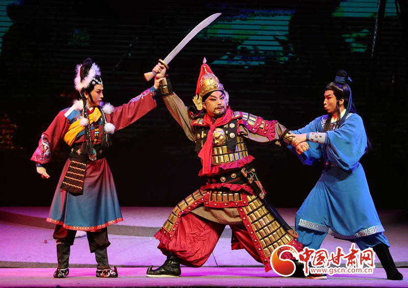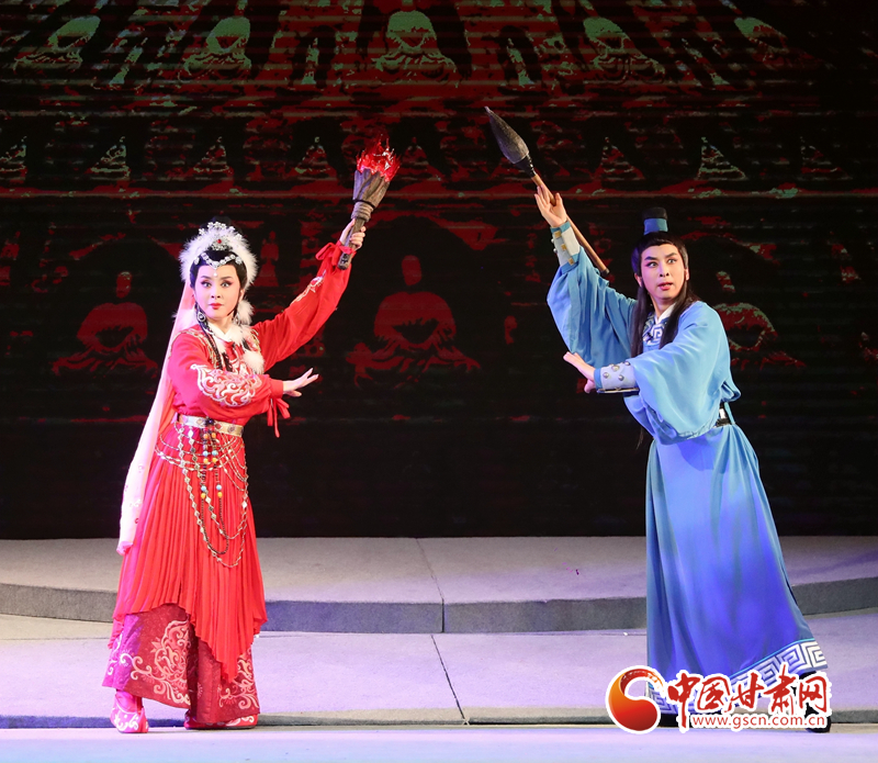 隴劇《敦煌》以回鶻族公主格麗莎的命運(yùn)軌跡為結(jié)構(gòu)框架和發(fā)展脈絡(luò),描繪了一幅炎黃子孫在血與火的洗禮中,保護(hù)中華民族文化的宏偉畫卷,充分詮釋了敦煌文化“美人之美”“美美與共”的開放胸襟,“止戈為武”“協(xié)和萬(wàn)邦”的和平思想,“和為貴”“和而不同”的東方智慧以及“自強(qiáng)不息”的奮斗精神、“舍生取義”犧牲精神。