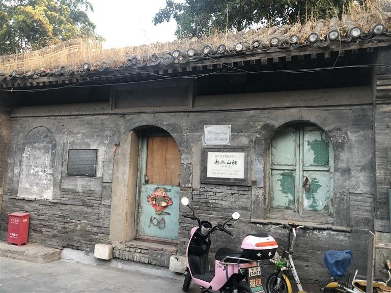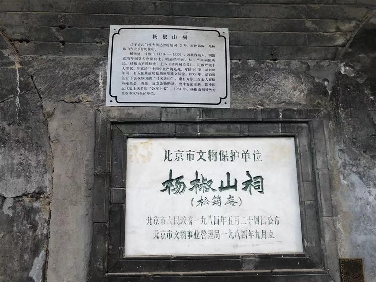 就是在這個(gè)胡同里,我看到一個(gè)歇山式屋頂?shù)姆课荩严喈?dāng)?shù)钠茢。蓓斏祥L(zhǎng)滿(mǎn)了凄凄荒草,門(mén)窗皆已破爛不堪。但是門(mén)旁的墻壁上卻鑲嵌著一塊匾,近前一看,上面寫(xiě)著“楊椒山祠”。喲,這就是楊椒山在北京的祠。