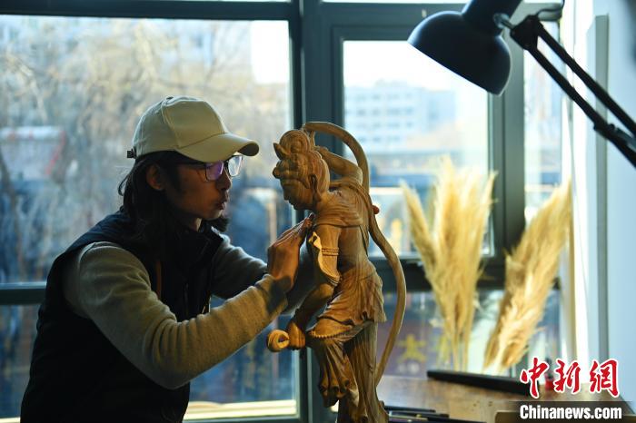 1月下旬,在甘肅蘭州技能人才服務產業(yè)園內,季茂杰進行敦煌元素的木雕創(chuàng)作。李亞龍 攝
