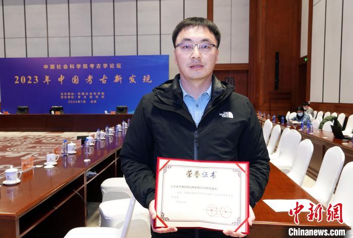 1月30日,2023年中國考古新發(fā)現(xiàn)在北京揭曉發(fā)布,肯尼亞共和國博高利亞湖舊石器時(shí)代遺址入選中國2023年國外考古新發(fā)現(xiàn),趙清坡代表項(xiàng)目領(lǐng)取榮譽(yù)證書在會場留影。中新網(wǎng)記者 孫自法 攝