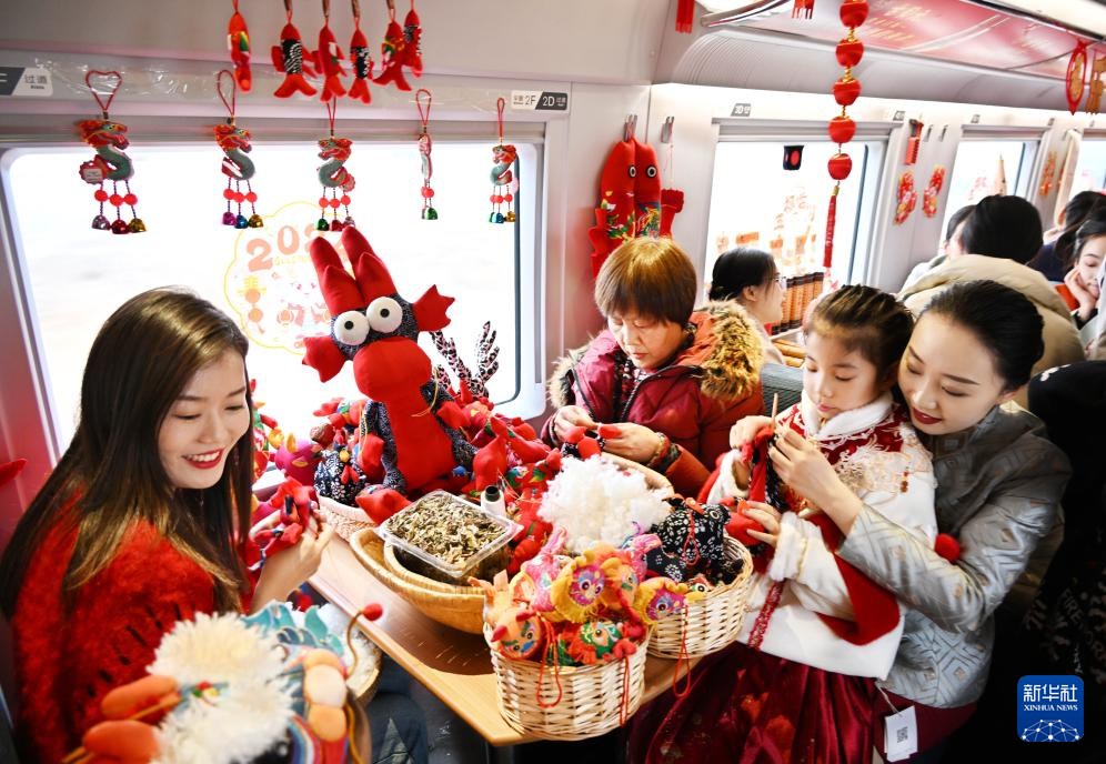 當(dāng)日,中國(guó)鐵路濟(jì)南局集團(tuán)有限公司青島客運(yùn)段在齊魯環(huán)游線G6955次列車上開展“年俗非遺進(jìn)高鐵”活動(dòng),讓旅客在旅途中感受傳統(tǒng)文化的魅力,營(yíng)造濃郁的節(jié)日氛圍。