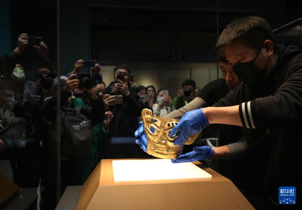 當(dāng)日,四川廣漢三星堆遺址出土的珍貴文物——金面具和豎披發(fā)青銅人像在上海博物館東館特展廳內(nèi)開箱,移入展柜。坐落于黃浦江東岸的上海博物館東館將于2月2日啟用,開幕展覽“星耀中國:三星堆·金沙古蜀文明展”將對(duì)公眾開放。