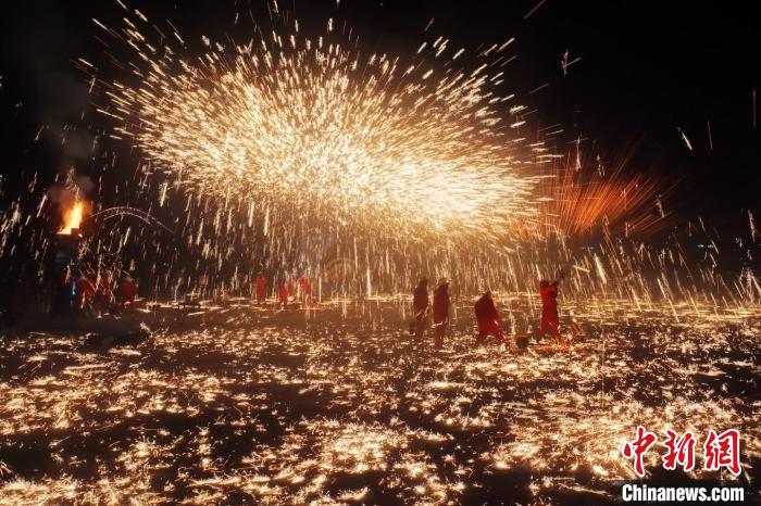 永靖王氏鑄造技藝傳承人在永靖黃河岸邊表演了國家級非物質文化遺產“打鐵花”,讓民眾享受了一場視覺盛宴。侯奇志 攝