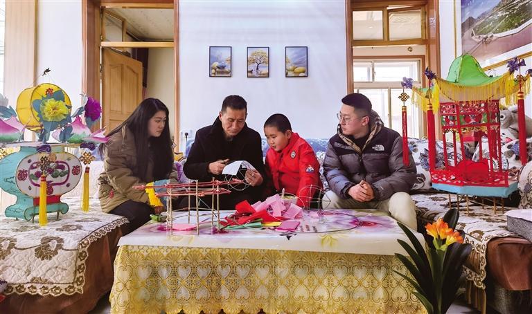 正月初十,記者走進(jìn)魏世發(fā)家中,院中一盞盞精美的花燈擺放有序,色彩鮮艷、栩栩如生,呈現(xiàn)出皋蘭傳統(tǒng)手工花燈技藝的魅力。朱榮亮是石洞小學(xué)二年級(jí)學(xué)生,一次偶然的機(jī)會(huì)接觸到什川花燈,便產(chǎn)生了濃厚的興趣。他說:“以前見到花燈我就非常喜歡,今天媽媽專程帶我來到魏爺爺家學(xué)做花燈,非常有趣。以后有機(jī)會(huì),我會(huì)帶著對(duì)花燈感興趣的同學(xué)來魏爺爺家跟他學(xué)做花燈。”