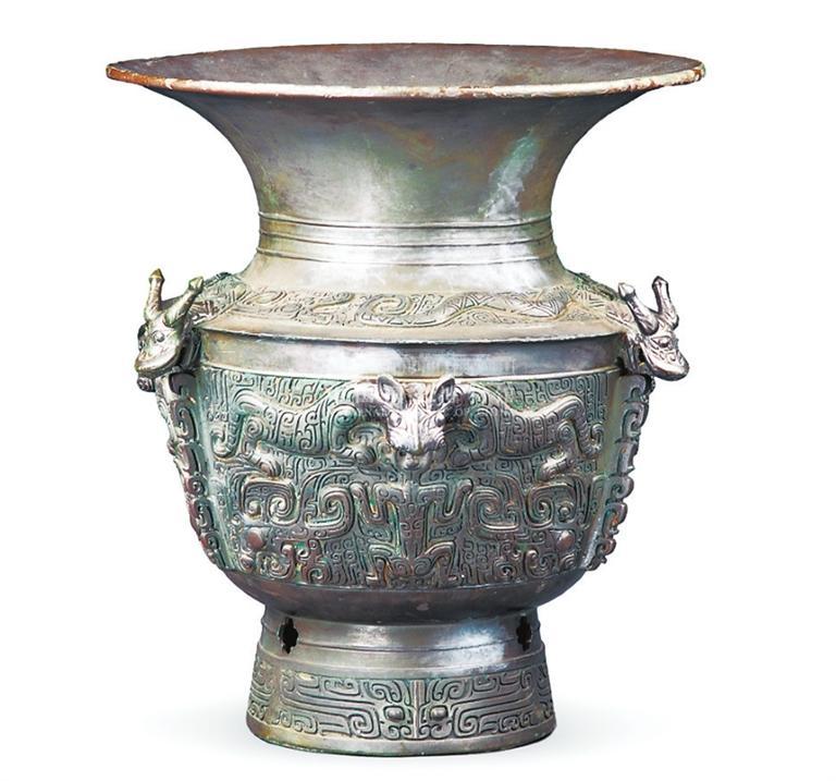 中國(guó)國(guó)家博物館收藏的龍虎紋青銅尊,高50.5厘米,重26.2千克,為一件體形較高大的盛酒器。青銅尊肩部以圓雕和浮雕相結(jié)合,塑造3條生動(dòng)的蟠龍形象,龍身蜿蜒,龍首探出,額有雙角,闊吻巨口,兩眼大睜。腹部紋飾為一個(gè)虎頭兩個(gè)虎身,虎口之下有一人形,人頭銜于虎口之中?;⑸硐路揭造槔鉃榻纾梼少琮埾鄬?duì)組成的獸面。從主體花紋看,龍、虎、人造型莊嚴(yán)穩(wěn)重、奇特神秘,特別是龍頭和虎頭用澆鑄法從外壁突兀凸起,雄健粗獷,比起用高浮雕法更具有一種威武逼人的悍氣。龍虎尊圓形大口表示上天,肩部神龍游蕩于空中;猛虎張牙舞爪守護(hù)大地。龍虎尊的鑄造采用十八塊母范經(jīng)兩次焊接而成,渾然一體,毫無痕跡。整器工藝精湛,花紋線條洗練,是商代青銅器中的精品。