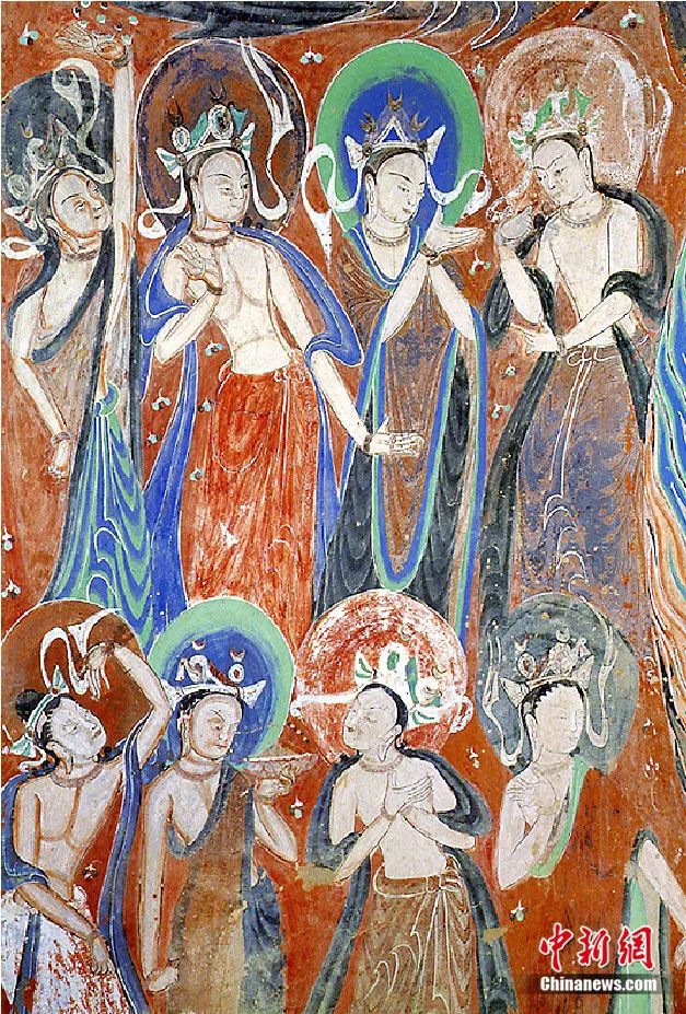 張?jiān)郑憾鼗捅诋嬛校兄袊?guó)傳統(tǒng)神話中的神靈形象,如東王公、西王母、菩薩、觀音、伏羲、女媧、雷公,以及青龍、白虎、朱雀、玄武等祥瑞動(dòng)物和異獸形象;也有來(lái)自印度—西域典型的神靈形象,有阿修羅、迦樓羅(金翅鳥(niǎo)王)、緊那羅(樂(lè)天)、大蟒神等等。除印度佛教及其藝術(shù)影響外,具有波斯—中亞藝術(shù)典型特色的連珠紋、對(duì)鳥(niǎo)對(duì)獸紋在敦煌壁畫中也非常流行;壁畫人物頭飾“三面寶冠”上裝飾的月形、日月形飾物題材,來(lái)源于薩珊波斯。又如北朝時(shí)期敦煌壁畫中的人物造型風(fēng)格,既有西域式的“龜茲風(fēng)”,又有來(lái)自中原、南朝的“褒衣博帶”“秀骨清像”式。