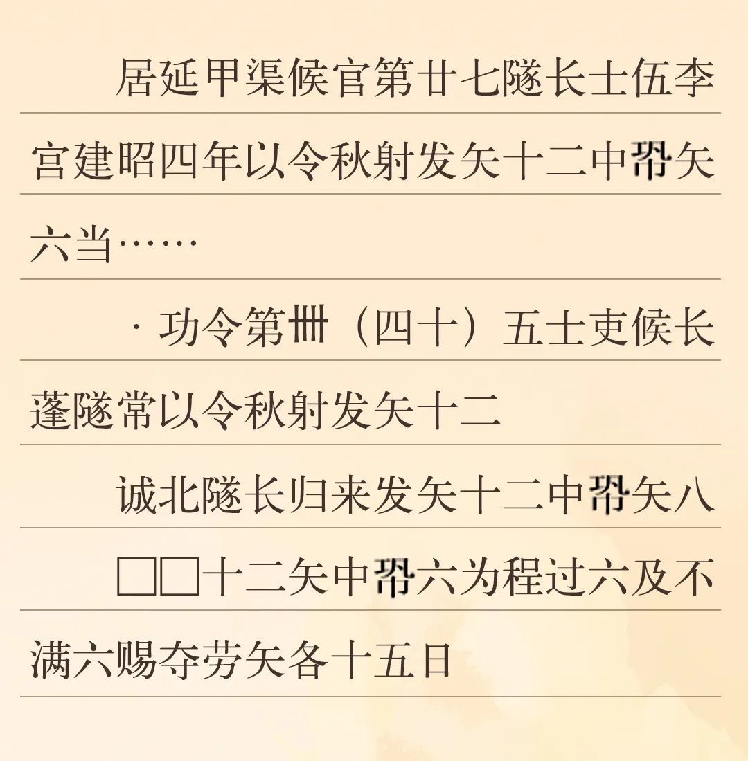 漢代對于官吏的考核分為文職和武職。文職主要考核書寫能力、治理能力、財(cái)務(wù)能力、法律能力等;武職考核主要是一年一度的射箭考核,因?yàn)樵谇锛九e行,故稱為“秋射”,發(fā)十二箭,中六箭為合格(即“中程”)。河西邊塞的官府通過秋射這一活動,借以考察和檢驗(yàn)邊塞吏員們的軍事技術(shù)水平,并以此作為賜勞和奪勞的依據(jù)。為了提高吏員們的射箭技術(shù),邊塞官府還派專人來管理訓(xùn)練吏卒。邊塞參加秋射的主要是烽燧的燧長、部塞的候長、候官的候等吏員。