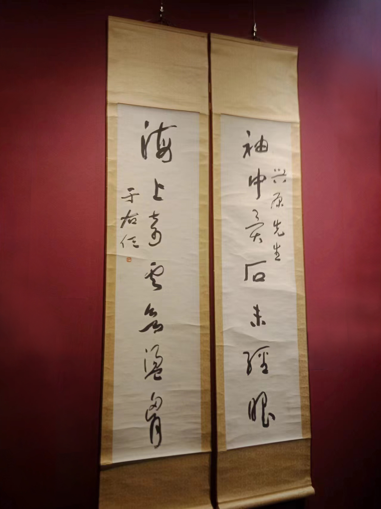 這次展出的于右任先生書法十余幅,有草書、行書和楷書。草書古詩“蜀本九經(jīng)最先出,后來孳乳到長興。蒲津毋氏家錢造,海內通行價倍增(此幅落款‘五十一年’,應是1962年先生去世前的作品)”,行書七言聯(lián)“袖中異石未經(jīng)眼,海上奇云未蕩胸”,楷書七言聯(lián)“萬卷藏書宜子弟,十年種木長風煙”等,書藝嫻熟,各有特色。所展墨寶筆法老練,墨氣逼人,筆者懷著崇敬的心情駐足敬賞,猶如與先生會面,久久不忍離去。