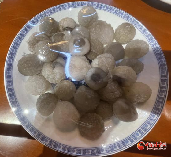最令我過目難忘的是“中華百家宴”,我曾經(jīng)在其他地方的玉器展上看到過“滿漢全席”,而玉器大多經(jīng)打磨雕琢,太過匠心。臨洮洮河石文化博物館的這桌“中華百家宴”,則基本是石頭原貌,在大自然的雕琢下呈現(xiàn)出獨(dú)特的形態(tài),更顯奇特曼妙。一碟碟的“珍饈佳肴”上覆保鮮膜,有剛剝了殼的軟嫩荔枝,有點(diǎn)綴著紅辣椒綠蔥花的連皮燉肉塊,有表面起酥的炸肉串......看在眼里就覺鮮香可口,令人垂涎欲滴。若不是隔離繩攔著,若不是每個碗碟上都有保鮮膜蓋著,看到忘乎所以,若是拿起筷子夾一塊大快朵頤,滿嘴牙怕要分崩離析。
