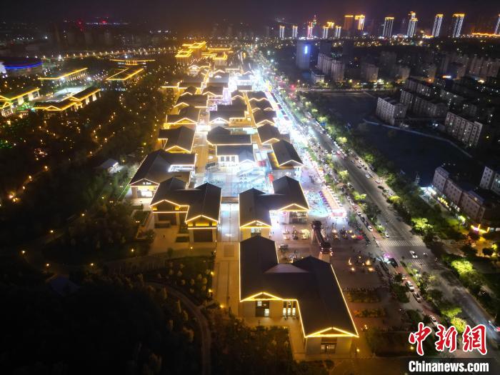 圖為明清街夜市燈光點亮具有武威文化元素的“天梯山石窟”彩燈。(無人機(jī)照片)  戴文昌 攝