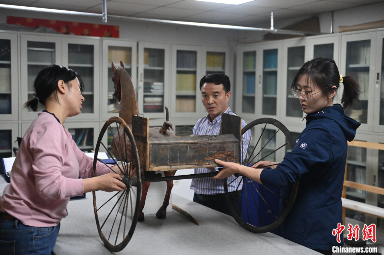 甘肅省博物館工作人員組裝復(fù)原漢代彩繪木軺車(chē)。李亞龍 攝