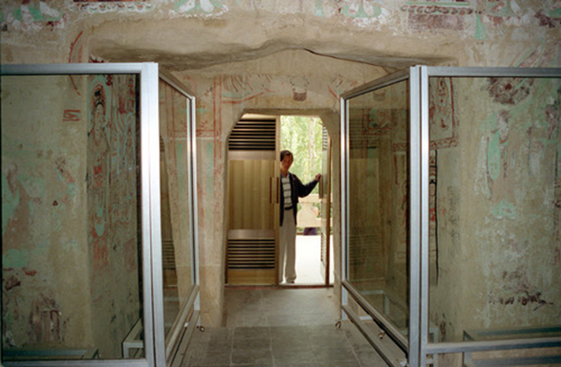 圖為莫高窟的367個洞窟安裝了鋁合金窟門,并在94個開放的洞窟安裝了玻璃屏風(fēng),即保護了壁畫的彩塑,又不影響參觀者視線。新華社記者彭張青攝(1996年11月24日發(fā))