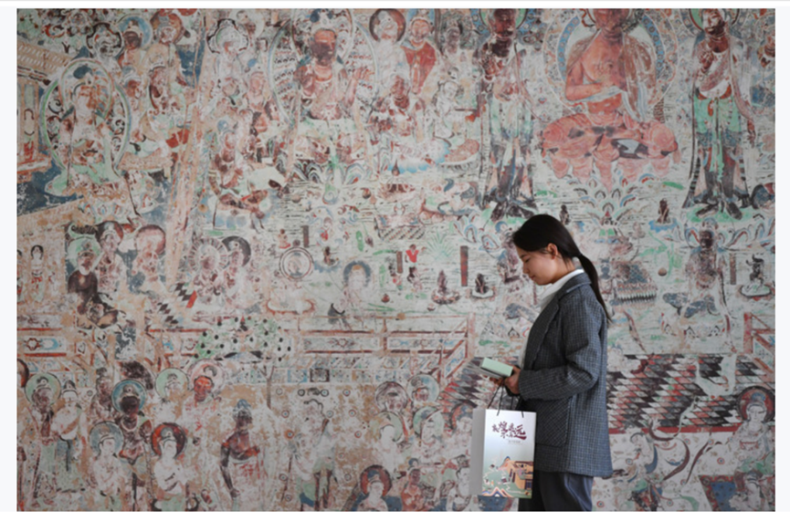 圖為敦煌研究院文物數(shù)字化保護團隊創(chuàng)意營銷人員廖雪婷從一幅高保真復(fù)制壁畫前走過(2023年4月25日攝)。新華社記者陳斌攝