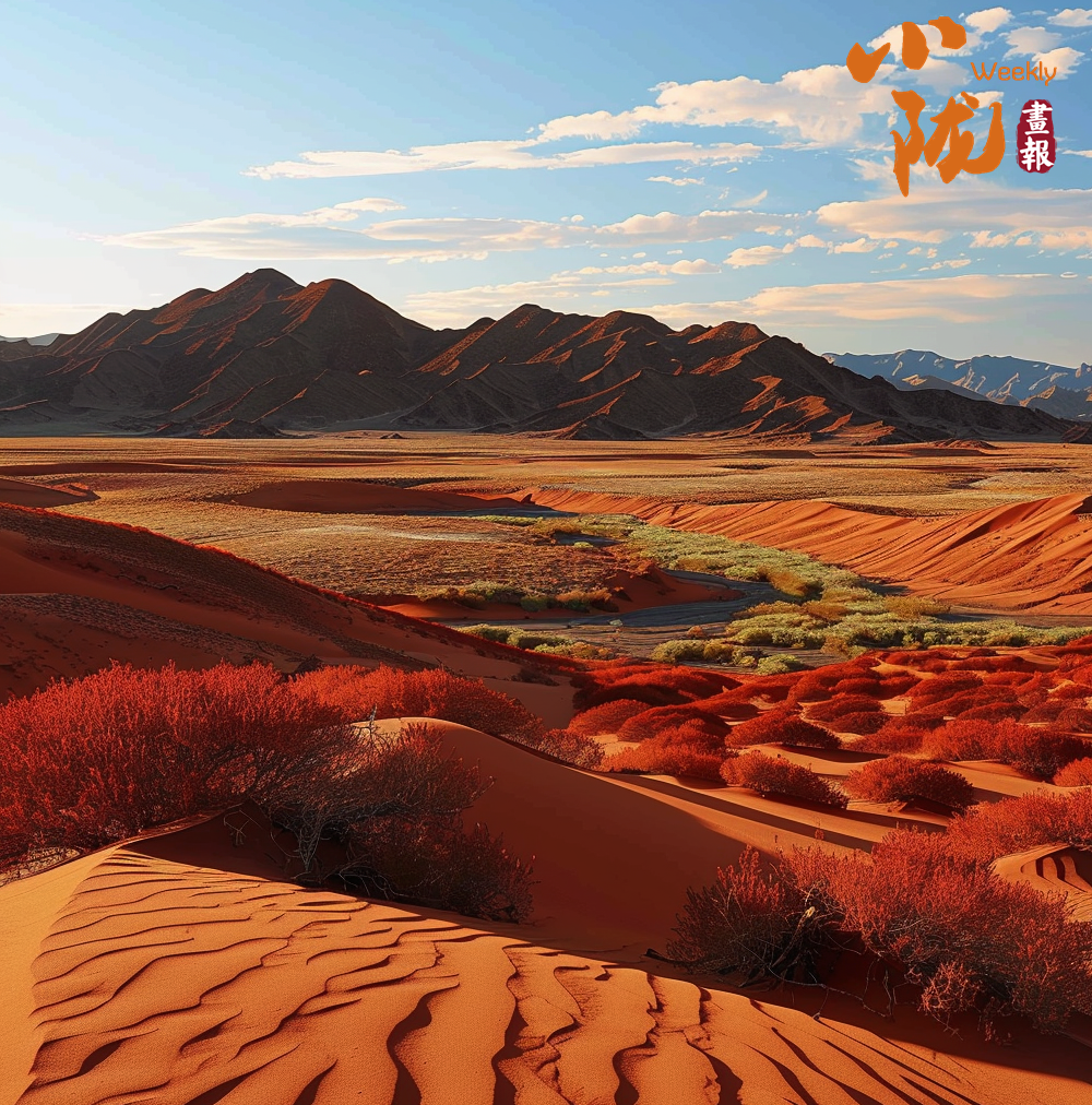 沙漠的沙粒在晚霞的映射下變得金黃而溫暖,仿佛覆蓋了一層光暈。遠處的山峰也被晚霞點亮,宛如一座座火焰般迎接著夜晚的到來。