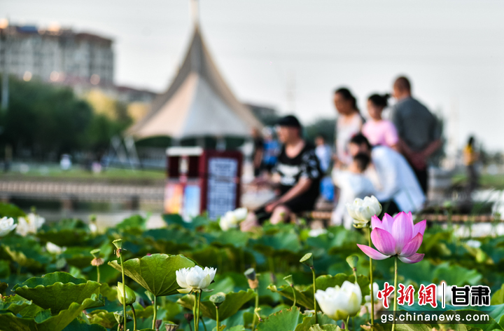 “接天蓮葉無窮碧,映日荷花別樣紅。”盛夏時節(jié),敦煌大漠綠洲持續(xù)高溫,鳴沙山下各種植物茁壯生長,黨河風(fēng)情線上的荷塘里荷花也競相綻放,紅的、白的,一朵朵,一簇簇,在微風(fēng)中搖曳,吸引眾多游人前來休閑避暑,賞荷納涼。王斌銀 攝