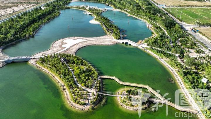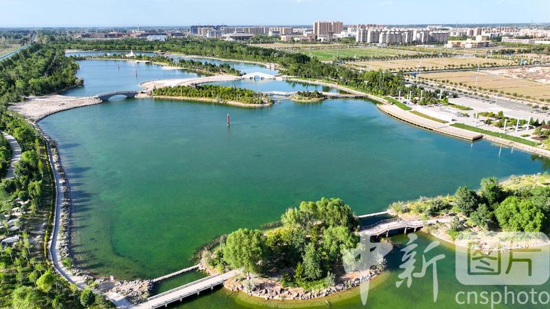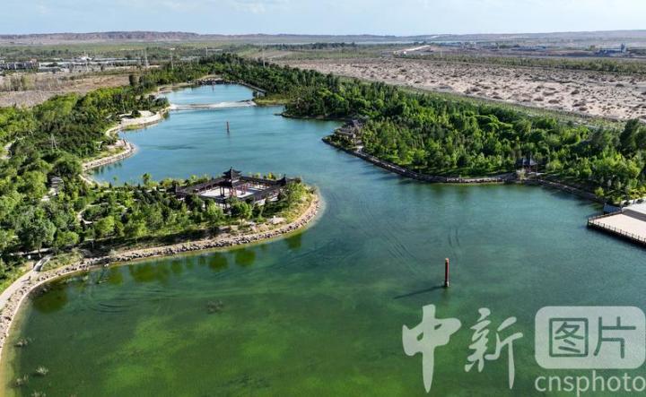 2024年7月27日,航拍甘肅省酒泉市金塔縣城西生態(tài)湖,綠意盎然,生機(jī)勃勃,構(gòu)成了“戈壁水鄉(xiāng)”的獨(dú)特畫(huà)卷。 中新社發(fā) 曹紅祖 攝