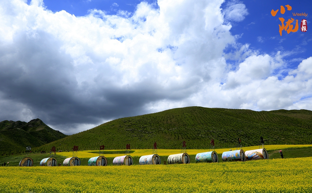 遠(yuǎn)處,山巒高低起伏;近處,黃綠相間。金黃的油菜花和藍(lán)天、雪山、白云融合在一起,組成了別致的夏日美景,充滿了西部特有的浪漫色彩。