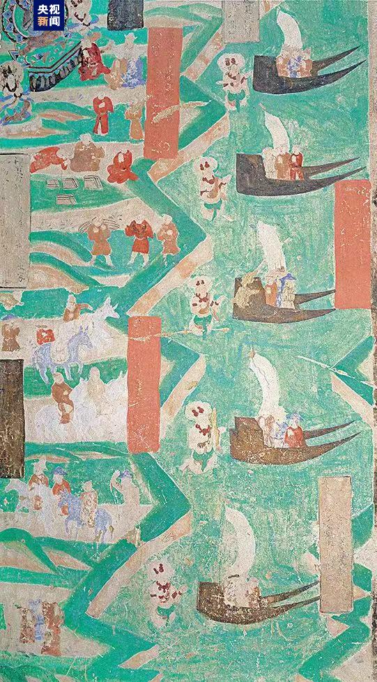 雙尾帆船:五只雙尾帆船方頭平底,尾尖上翹呈燕尾狀,每只船上均坐三人,河岸曲折蜿蜒,岸上行人往來穿梭,一場盛大的航行正在啟幕。莫高窟第98窟,五代。