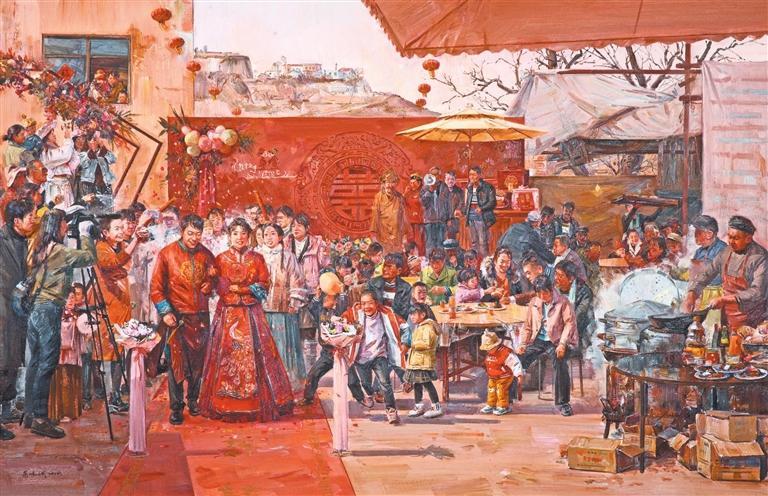 《成紀二月喜盈門》描繪了秦安一對新人舉辦婚禮的場景。身著傳統(tǒng)服飾的新人,在親朋好友祝福中朝觀眾走來。靜心觀察,會發(fā)現(xiàn)每個人都充滿鮮明的角色感,樸拙的外表、內蘊的情感、濃厚的民俗、歡樂的場景,共同交織成一方地域上的斑斕畫卷。