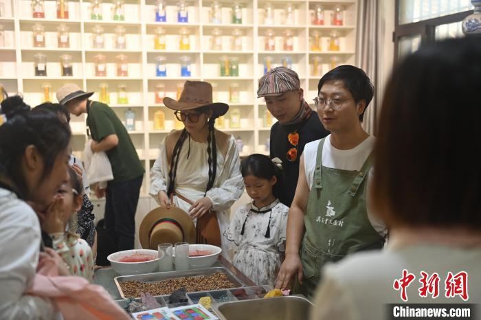 8月20日,甘肅敦煌莫高里工匠村內(nèi),研學(xué)導(dǎo)師向?qū)W員介紹敦煌礦物質(zhì)顏料。工匠村開設(shè)了泥板畫、彩繪、雕塑制作、剪紙、農(nóng)耕體驗(yàn)等課程,現(xiàn)已發(fā)展成為一個(gè)集敦煌文化講堂、壁畫書法研習(xí)、美術(shù)設(shè)計(jì)、彩塑制作教學(xué)、篆刻藝術(shù)、傳統(tǒng)釀酒體驗(yàn)、農(nóng)業(yè)產(chǎn)業(yè)發(fā)展等于一體的多功能實(shí)訓(xùn)基地。中新社記者 李亞龍 攝