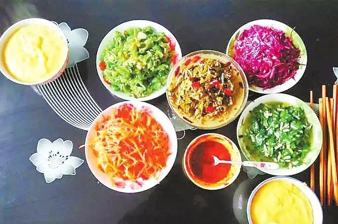 百人百心病,百人百口味?,F(xiàn)在的人吃馓飯,對(duì)菜品的要求越來(lái)越高了,除了酸菜,人們大多還會(huì)調(diào)一些涼菜,或炒一些菜,蘿卜的,肉丁的,山野菜的,虎皮辣子的,滿(mǎn)滿(mǎn)地?cái)[上一桌子,如錦上添花,令人食欲大增。
